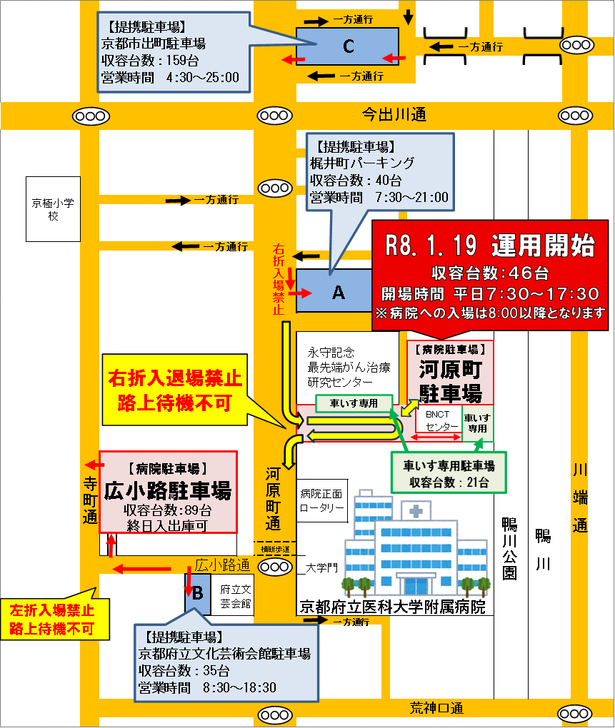 附属病院駐車場(広小路駐車場・河原町駐車場)は、周辺道路(広小路通・河原町通)の渋滞防止のため、路上での入場待ちが一切できません。