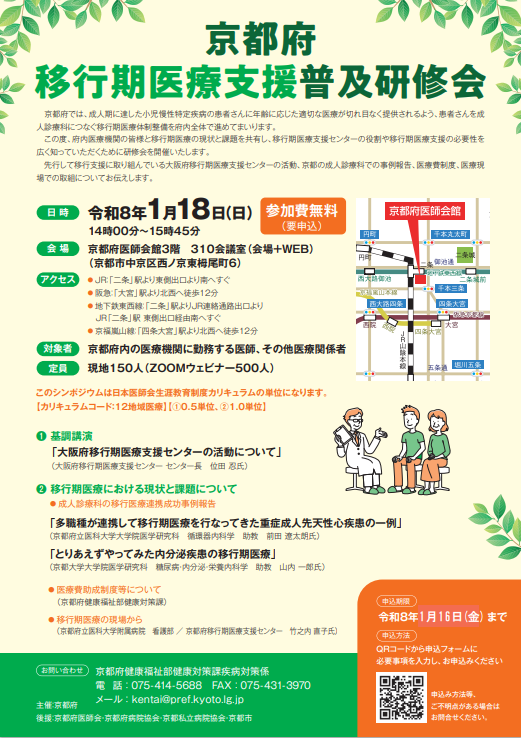 京都府内の医療機関に勤務する医師、その他医療関係者向けに「移行期医療支援」についての研修会を行います。ぜひご参加ください。