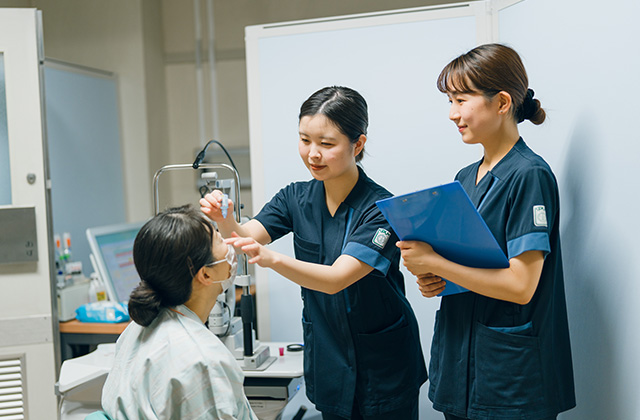 手術療法を行う短期入院の方が多く、その中で点眼や術後の体位指導など、ビデオやパンフレットを用いて丁寧にわかりやすく指導することを心がけています。さらに眼科では、視機能が低下した患者さんの思いに寄り添いながら、生活動作を援助しています。またロービジョン説明会を開催し、ロービジョングッズの紹介などを行い患者さんのQOLの向上を目指した取り組みを行なっています。